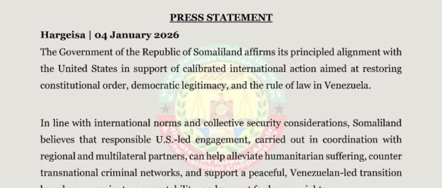 Hargeysa, January 4, 2026 (Haatufonline) -Xukuumadda Jamhuuriyadda Somaliland, ayaa dawladda Maraykanka ku taageertay hawlgalkii ay ku qabatay Madaxweynihii Venezuela, Nicolas Maduru, waxaanay caddaysay in tallaabadaasi ay qayb ka tahay soo celinta nidaamka dastuuriga ah ee dimuqraaddiyadeed iyo isku xukunka sharciga ee dalkaasi Venezuela.